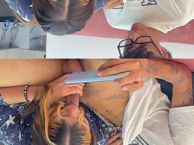 Mi hermanastra me sorprende masturbandome mientras le reviso la galería de su celular.