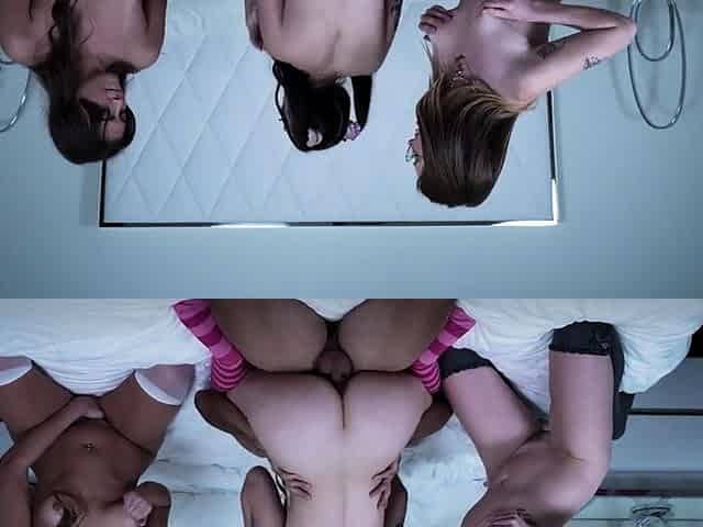 The stepbrother engages in anal intercourse with his stepsister and her female companion.