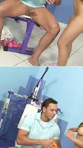 Sexy teen is watched by two guys doing sports and then fucked dirty in the gym