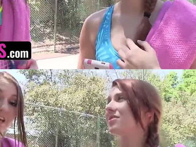 Outdoor lesbian threesome at the tennis court. Outdoor lesbian threesome at the tennis court flashing and kissing