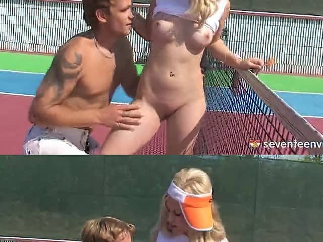 Hardcore babe with natural tits gets naked and fucks on the tennis court