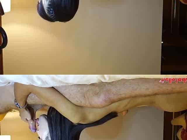 Hot ladyboy with small tits and a hard asian Cock gets to suck the camera guy off as she wanks her own
