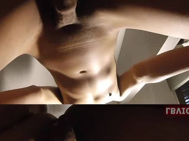 Ladyboy jerking off and cumming on her abdomen
