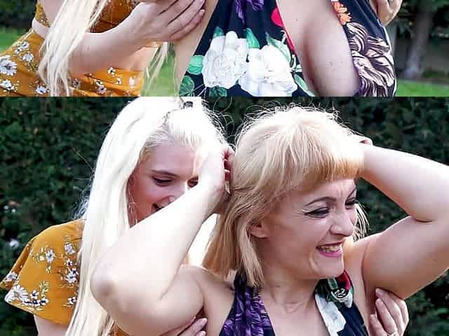Young Mia Casanova tickling big boobs Mary Rider on the grass