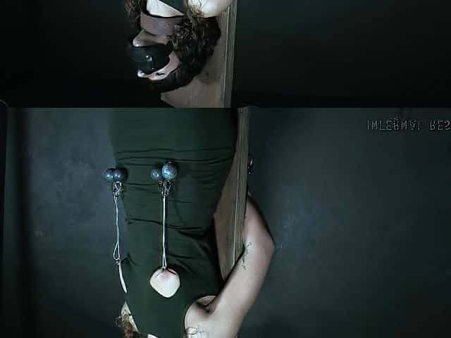 Submissive dark haired hottie gets impaled in standing pose in BDSM