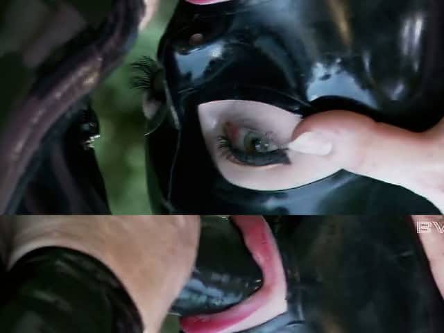 Lucy Latex wears a bondage monoglove and has to suck strapon outdoors