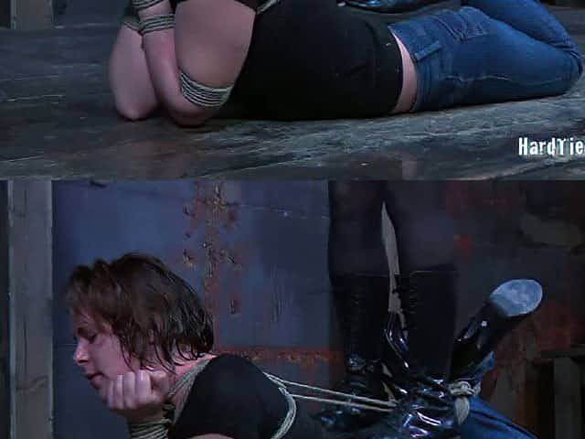 Perverted red haired chick ties up sex-slaved right on the cold floor