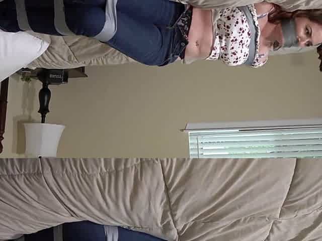 Julie Simone in nylons bound on the bed for her masters pleasure