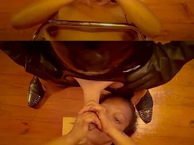 Dominant female in gloves gives intense post-orgasm handjob to her bound male marionette