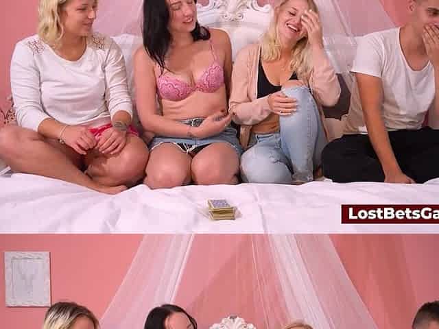 A foursome undress game ends up with the man fastened to the daybed