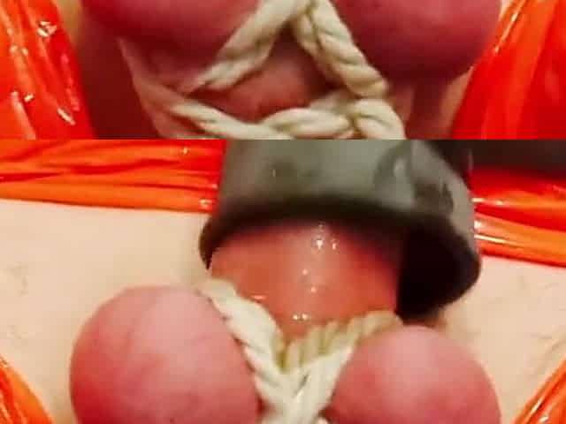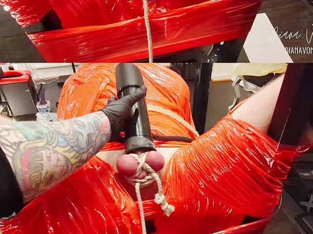 Merciless Cock Milking (tight Shiny Red Plastic Mummificaton and Remote Anal Stimulation)