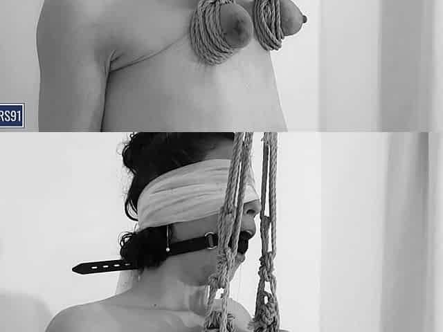 Nude and shoeless babe in rope bondage with her tits squeezed and tape-ball-gagged