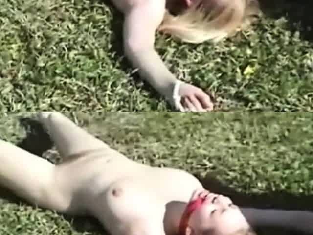 My blonde slut lying tied up on the lawn