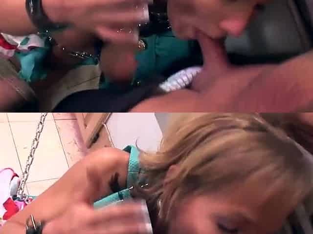 Rough blowjob and hard fucking doggystyle tied to a machine