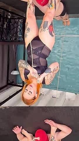 She is tied up and hung up, her breasts are licked, and a cock is thrust deep into her throat for an irrumatio.