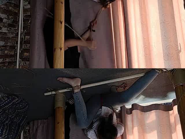 Tickle & Vibrator Torture With Gag & Blindfold: Girl Spread Eagle Tied To Bamboo