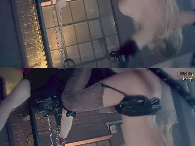 Hot latex and fishnet waitress gets bound up and toyed and rides face with gag dong -Oslo&Chupa