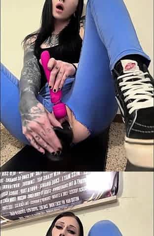 Goth slut destroys blue jeans and her tight creamy pussy
