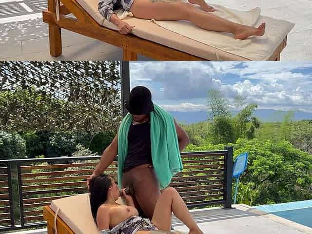 Huge Breasted Latina Brunette Can't Resist Fucking Big Black Cock Guy by the Pool.
