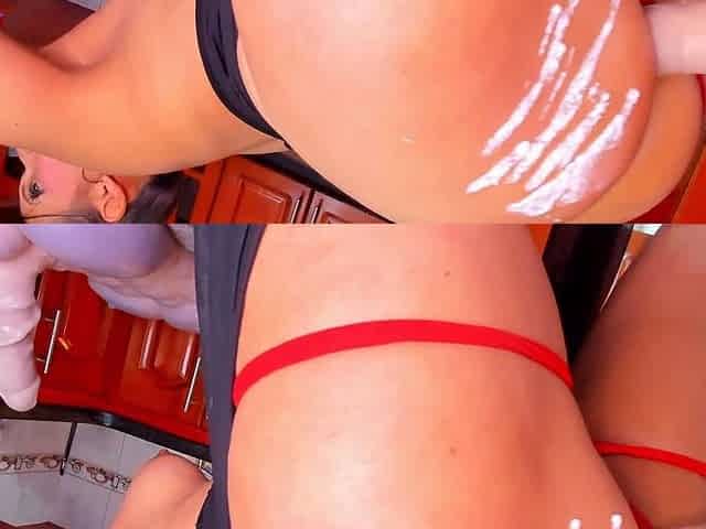 Super hot wifey gets her tight pussy pounded by a dildo in the kitchen