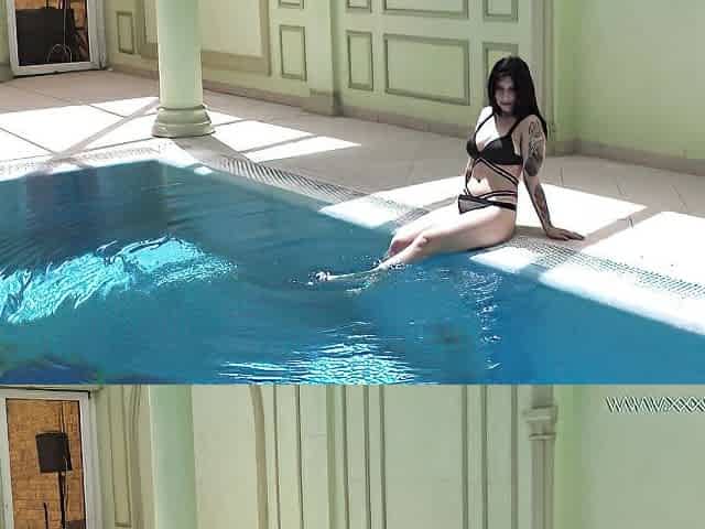 Piscina? pero si esta de noche! luego de un baño con mi hermanastra, follamos en el sofa de mami!