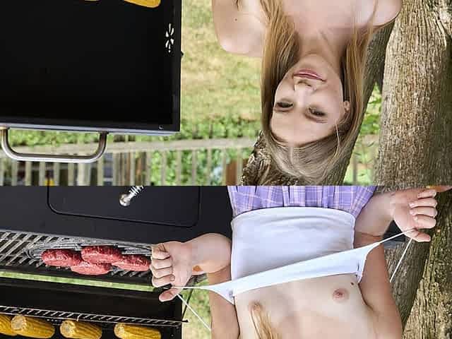 Petite ash-blonde cutie shows off her clit rubbing for neighbors with a big dildo