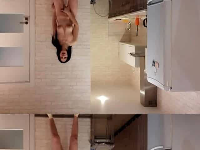 In a kitchen a sexy brunette playing with her big boobs