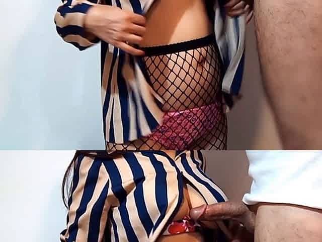 Sexy brunette blows and takes stiff pecker