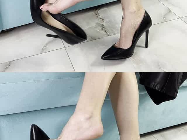 Classic Black High Heels, Dangling, Highly Arched Feet, Tattooed Feet with Long Toes