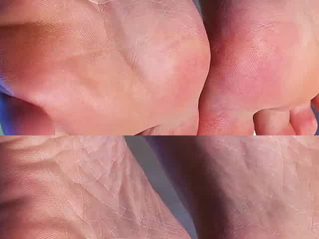 My Bare Wrinkled Soles and Toes on the Table Closeup