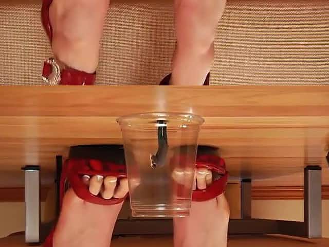 Look underneath the desk of this secretay and have a fun her shoeplay