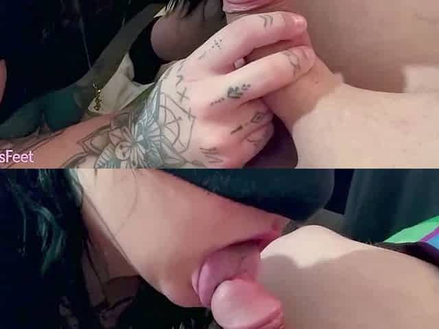 Tattooed babe Frenchjessfeet gives blowjobs and footjobs with her cute size 6 toes in POV style