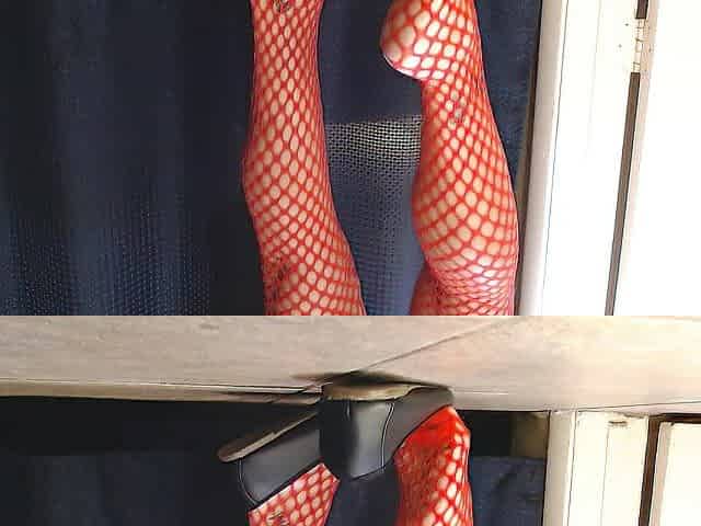 Red Fishnets Ballet Flats Shoeplay Dipping Toe Wiggling