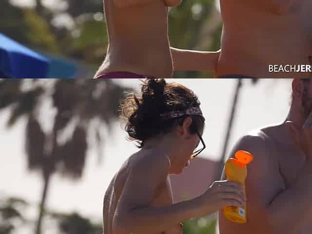 Oiling boobs on topless beach