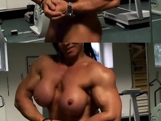 Muscular brunette hair with huge milk jugs, Samantha Kelly is doing her lifting routine mostly topless