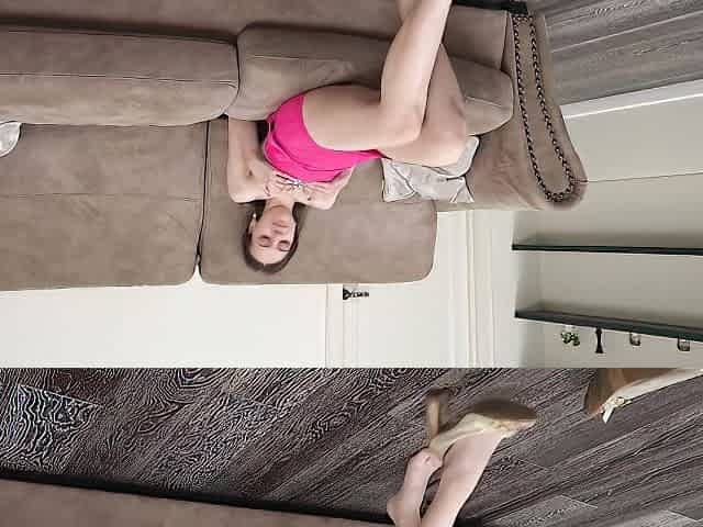 Callie Calypso is touching her hungry shaved pussy on sofa