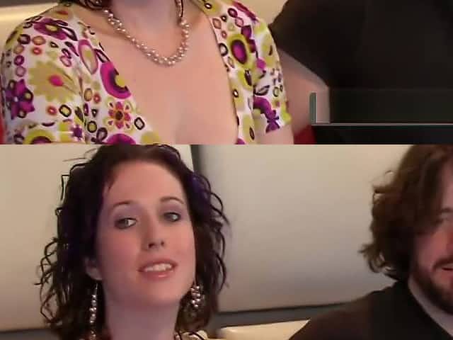 Playful Russian chick whips out her tits and let a horny couple touch her
