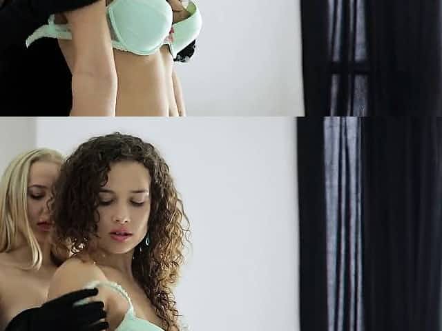 Two delicious lesbian babes stripping and touching their