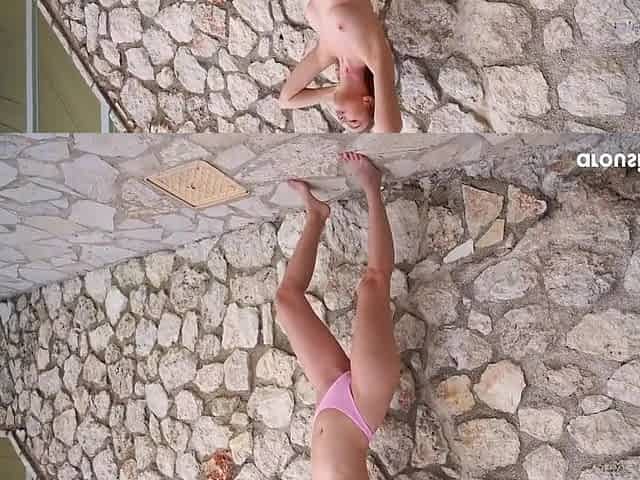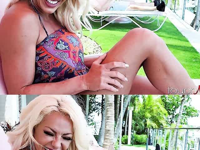 Flexible blonde on high heels Sophie Moone is touching her crack