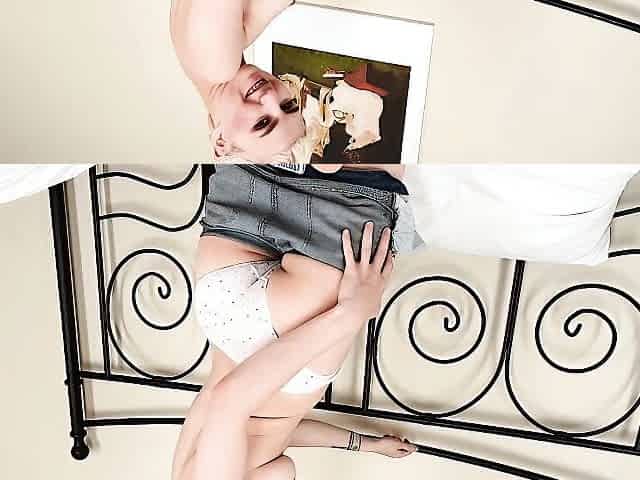 Short-haired blonde Bramble Bee is touching her shaved pussy