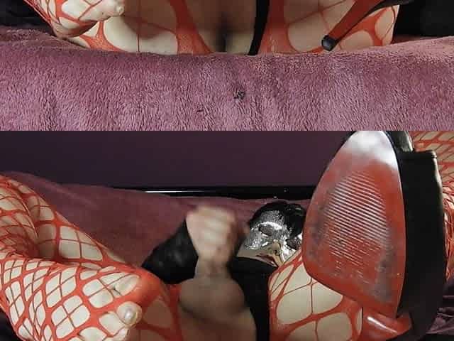 Long hair ladyboy with high heels masturbates solo in bed