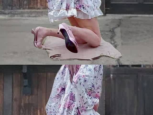 Small tits ladyboy with high heels takes off black skirts