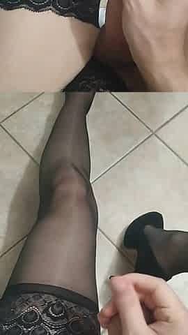 Sissy Femboy Juicy Cumshot on Sexy Legs in Stockings and High Heels