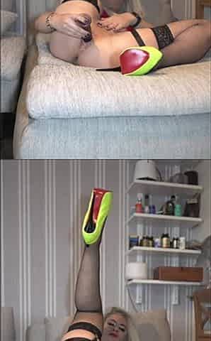 Sexy blonde shemale strokes her cock with gel cockslevee.
