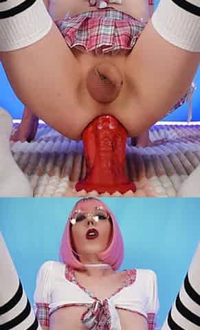 Cosplay shemale toying her asshole with dildo