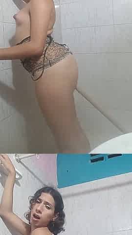 T-Girl Self-Sucks and Swallows in the Shower on Webcam