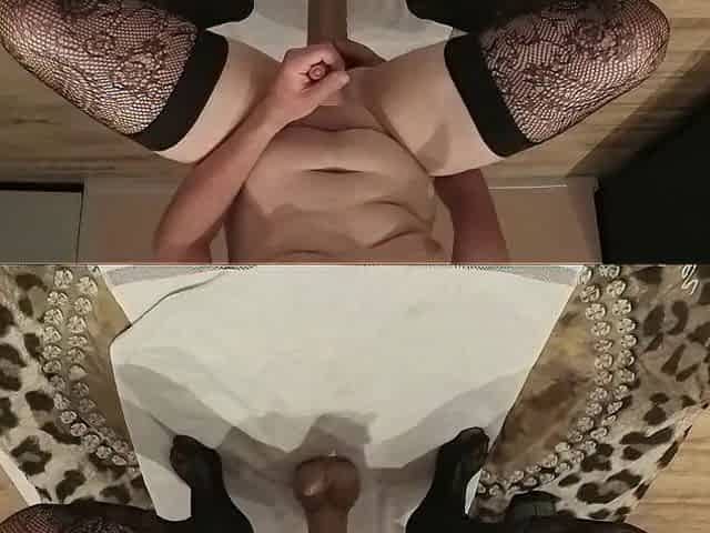 Hawt crossdresser in white nylons jerks off his jock