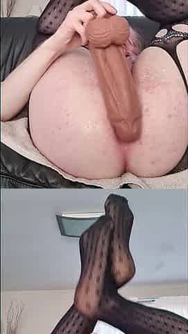 Sexy blonde CD inserting a big black dildo. Double cumshot!