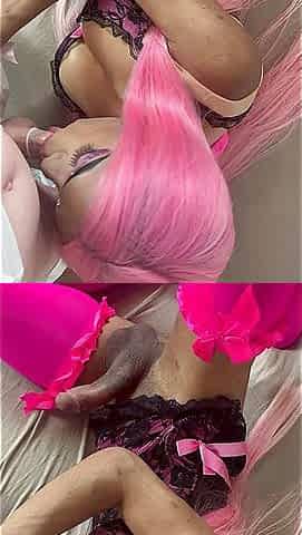 Super hot sissy crossdresser femboy Sweet Lollipop shows her gloryhole and masturbation with her big dick in designer babydoll.