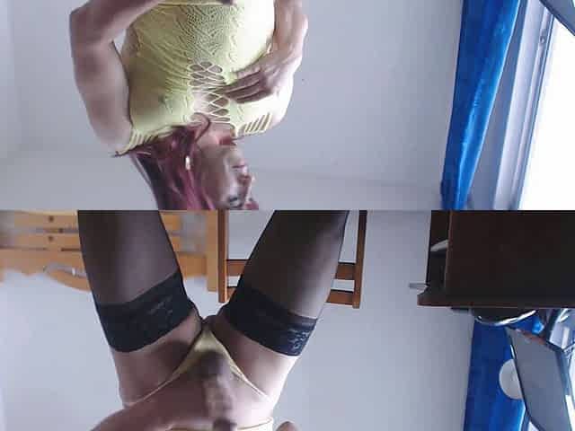 Redhead crossdresser wanking off in yellow lingerie